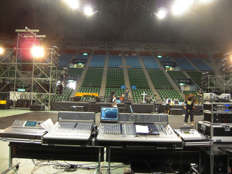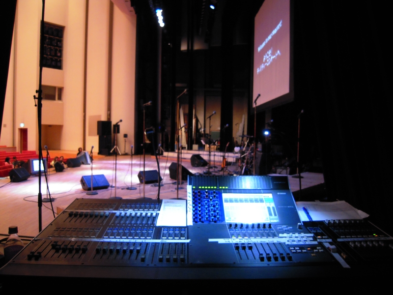 クワイアーマイクは左右合計18本、さらにソロシンガー用に5本、三味線の演奏もあったため三味線用に3本、ドラムに11回線、ピアノに3回線、ベース・ギター等で4回線、さらにワイアレスマイク4本で合計48回線。このようにインプットが多いのがゴスペルのコンサートの宿命です。