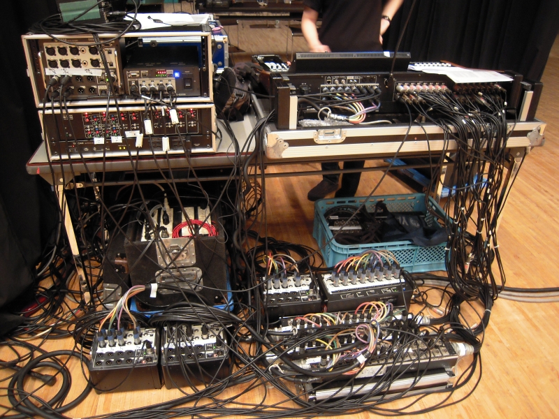 写真はモニター卓下のパッチ。ステージ内はアナログマルチケーブルで網羅し、モニター卓のYAMAHA LS9とREACシステムへパラレル接続を行ってあります。