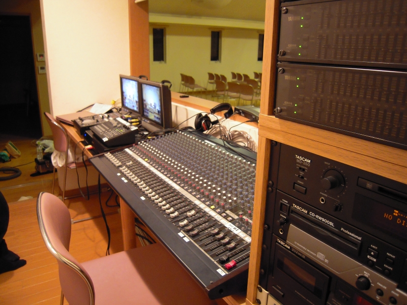 広いコントロールルーム。会堂の最後列後ろには広々とした調整室があります。音響ミキサー・映像ミキサー・照明ミキサー等、すべての調整を一人では行えません。担当者が2〜3名いても十分に作業が可能な広さを実現しています。会堂とコントロールルームの間の窓にはガラスが入っていないため、会堂内の音をそのまま聴く事ができます。マイクに入力されていない声や楽器の音も細かく聴く事ができ、プロジェクター操作等もやりやすくなります。